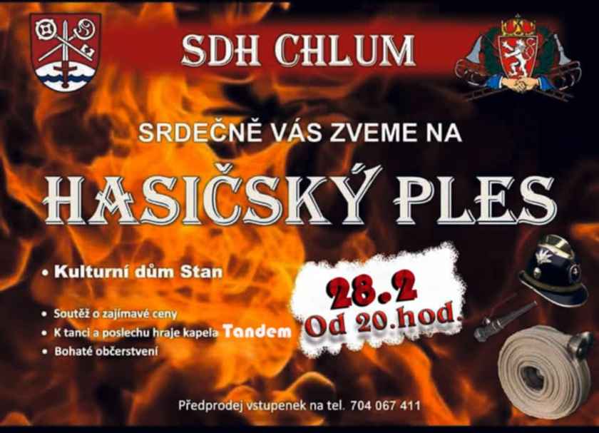 Ples 2026 KD Stan Kdy: 28. 2. 2026 19:00 – 1. 3. 2026 05:00 Kraj: Pardubický Typ akce: kulturní Zpět na kalendář 28.2.2026 Hasičský ples KD Stan, kapela Tandem Zobrazit mapu