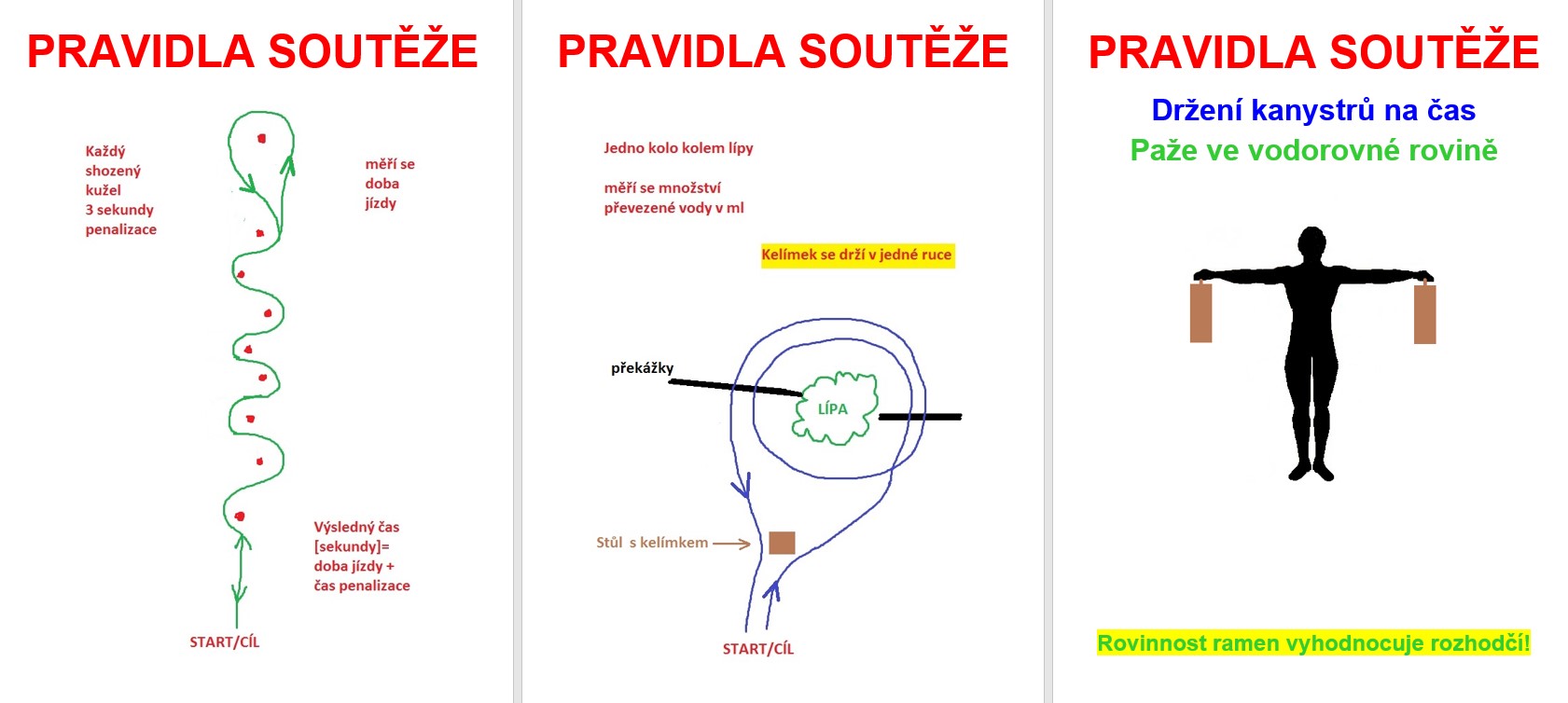 Držení kanystrů na čas, Slalom a Jízda zručnosti