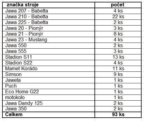 Zajímavostí je, že nevíce bylo strojů Jawa Babetta, celkem 28 strojů, a následovali je stroje Stadion, celkem 17 strojů.